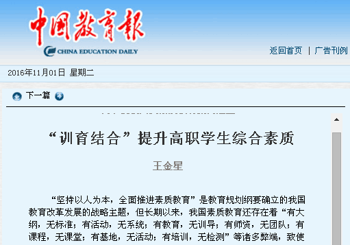 11月1日的《中国教育报》在第11版“职业教育 教改探索”版选登了我院党委书记王金星教授《“训育结合”提升高职学生综合素质》的案例报告。报告基于我院创造性开展的高职院校学生综合素质训育实践,介绍了我院所构建的高职学生综合素质训育体系和平台,探索并创新了“训育结合”的方法手段和课程、队伍、基地、活动“四位一体”的训育模式,以及“课程建设通识化、队伍建设专业化、基地建设现代化、活动建设品牌化”,全面推进素质训育工作,建立学校、家长和第三方“三位一体”的学生素质检测体系,全面、客观检测学生综合素质训育的质量效果,为高职学生综合素质训育工作不断走向深入提供坚实保障的做法和经验。